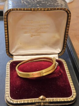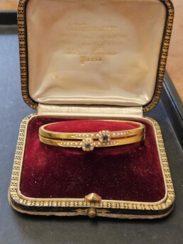 Magnifique bracelet forme jonc en or 18 carats ornée de 2 saphirs et de perles fines XIX éme siècle