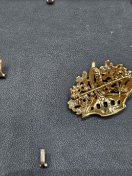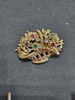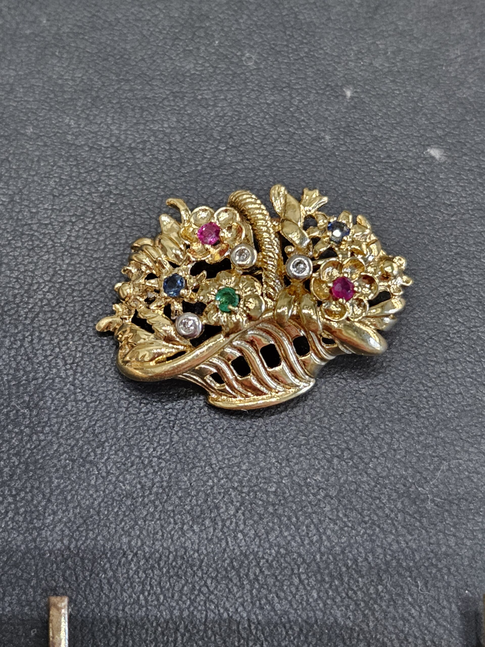 Magnifique pendentif pouvant aussi être porté en broche représentant un panier fleuri avec diamant, rubis, saphir et émeraude, années 1940-1950