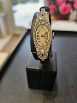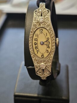 Splendide montre en platine , ornée de diamants, de style  » Art déco  » des années 1920 . Cette montre fonctionne parfaitement avec son mouvement d’origine .