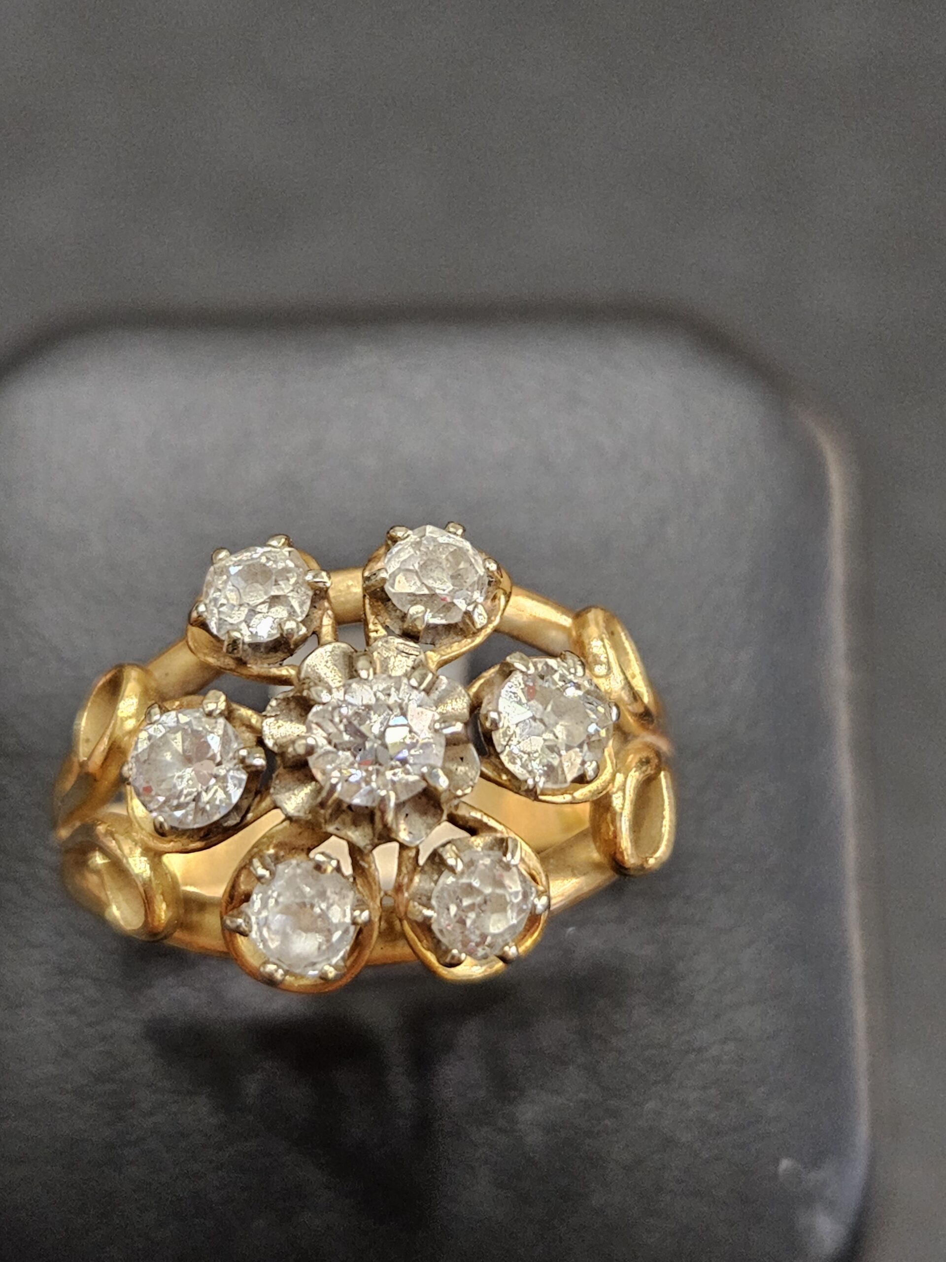 Cette bague des années 1960 est composée d’une « marguerite » de 7 diamants délicatement posée sur un filigrane d’or terminé par des volutes où soutenant cette marguerite