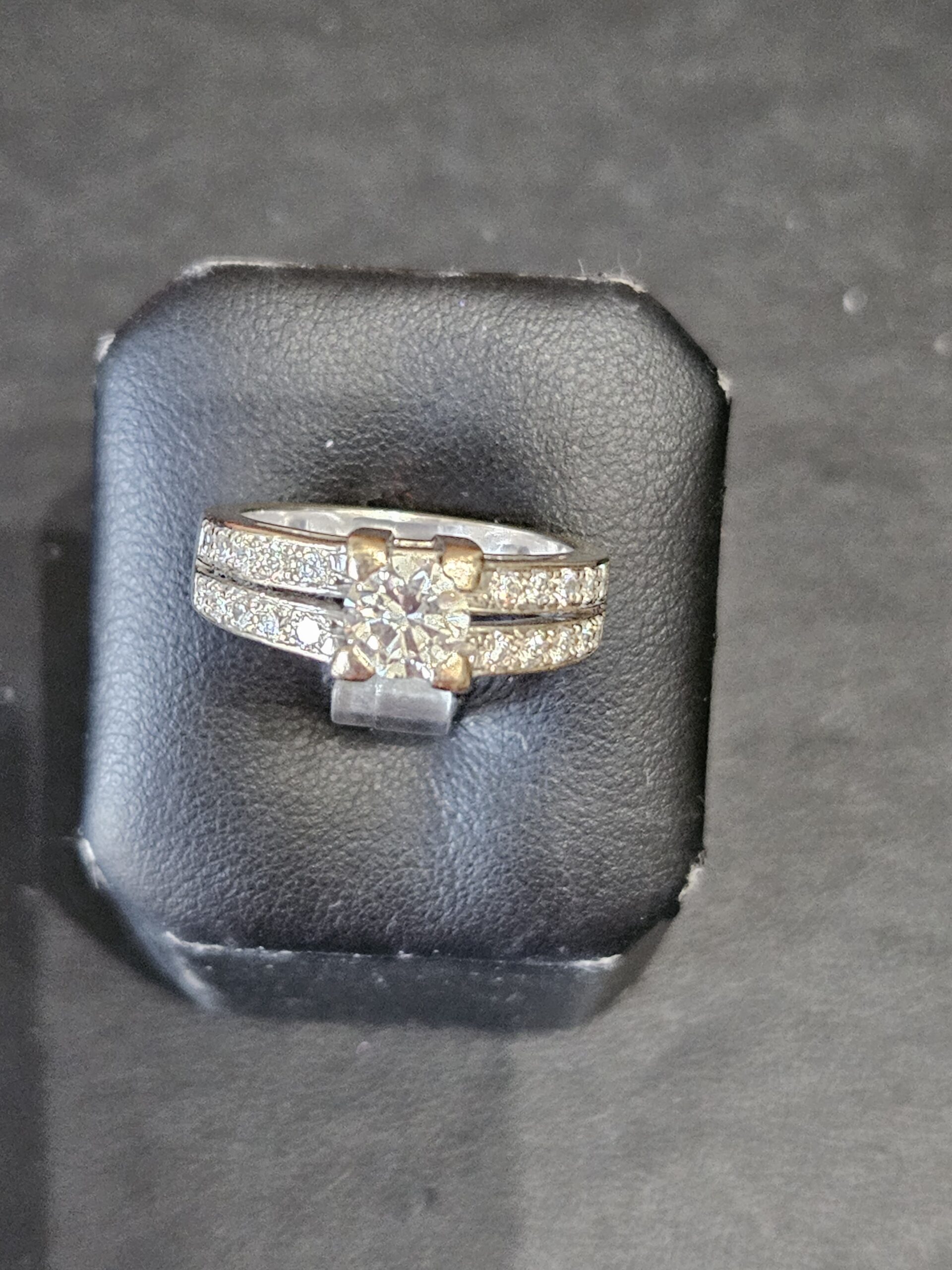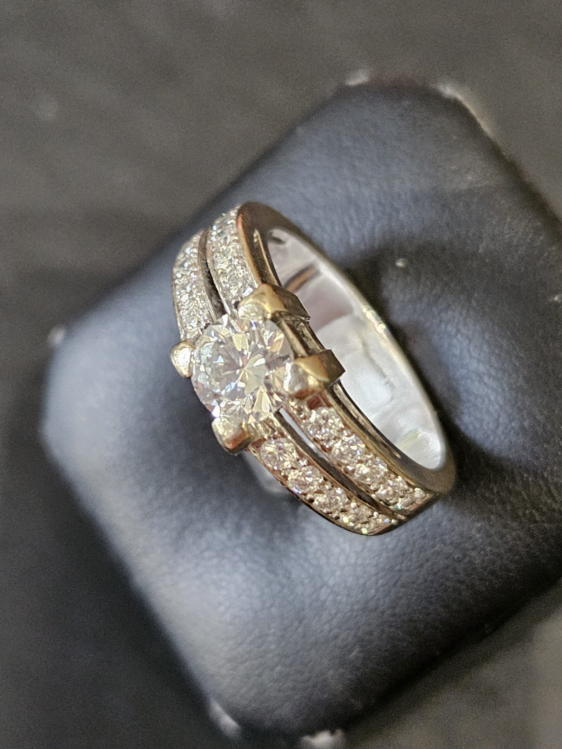 Caratsdiamant central 1carat environ 0,50 sur les côtésPoids7,06 grammesTailleTour de doigt : 54PierreDIAMANTS Prix3800 euros