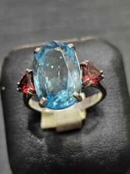 Très jolie bague en or 18 carats ornée d’une topaze bleue épaulée de deux grenats , années 1960